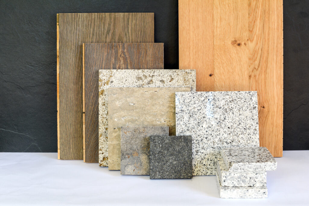 Material collage with natural stone, tiles and wooden parquet floor for renovation of an apartment building